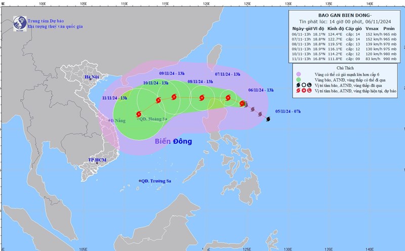At 7:00 a.m. on November 9, the storm moved in a West-Northwest direction, continuing to accelerate to 15 - 20 km/h. The center of the storm was located at about 18.7 degrees North latitude - 115.7 degrees East longitude, east of the North East Sea, 430 km east-northeast of Hoang Sa archipelago. The strongest wind near the center of the storm was level 12, gusting to level 14. Disaster risk level: level 3 in the east of the North East Sea.