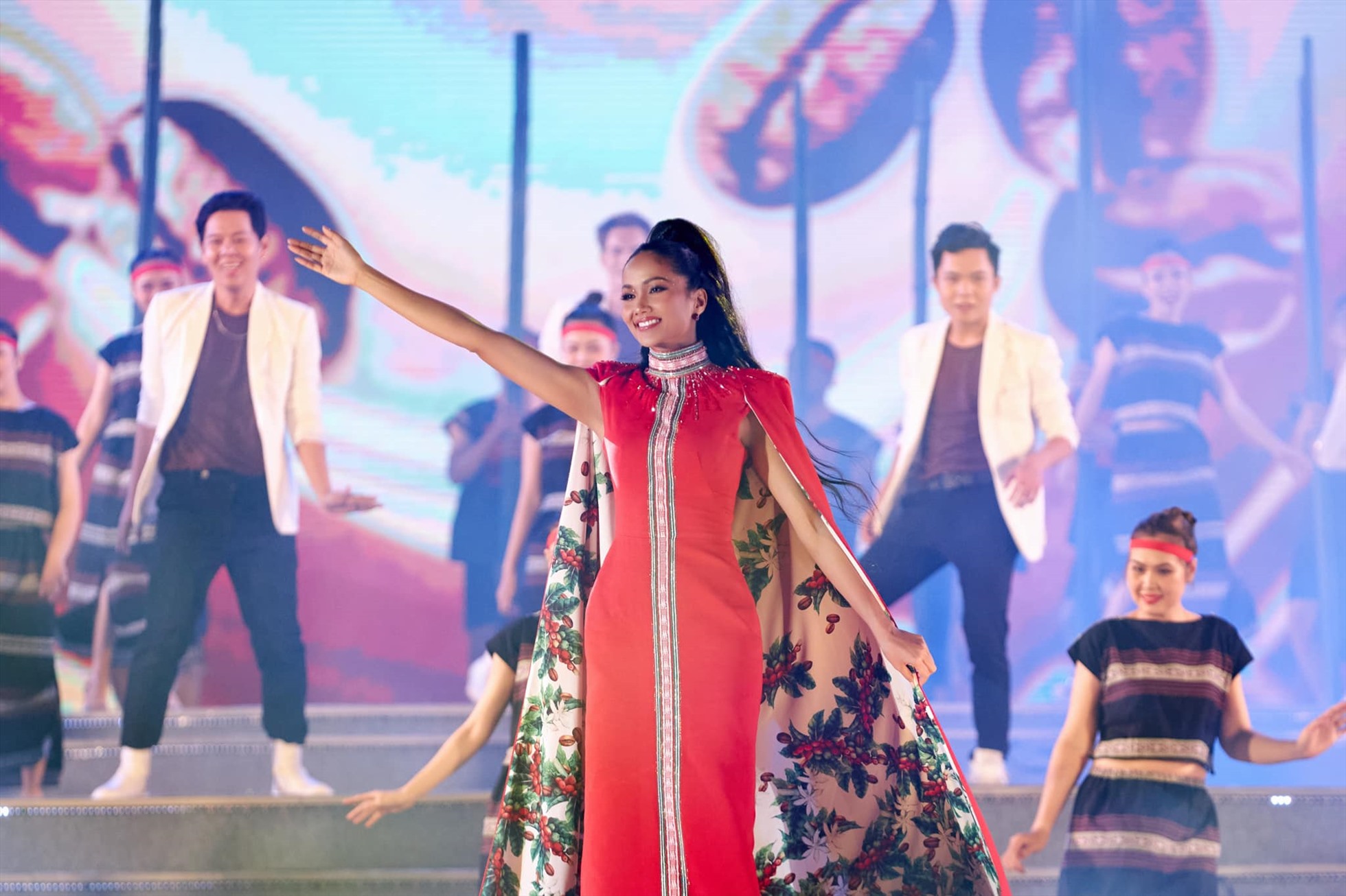 Hoa hậu H'Hen Niê hoá thân thành "Nữ thần mặt trời", đội vương miện hoa cà phê trong khuôn khổ Lễ hội Cà phê diễn ra tại Buôn Ma Thuột.