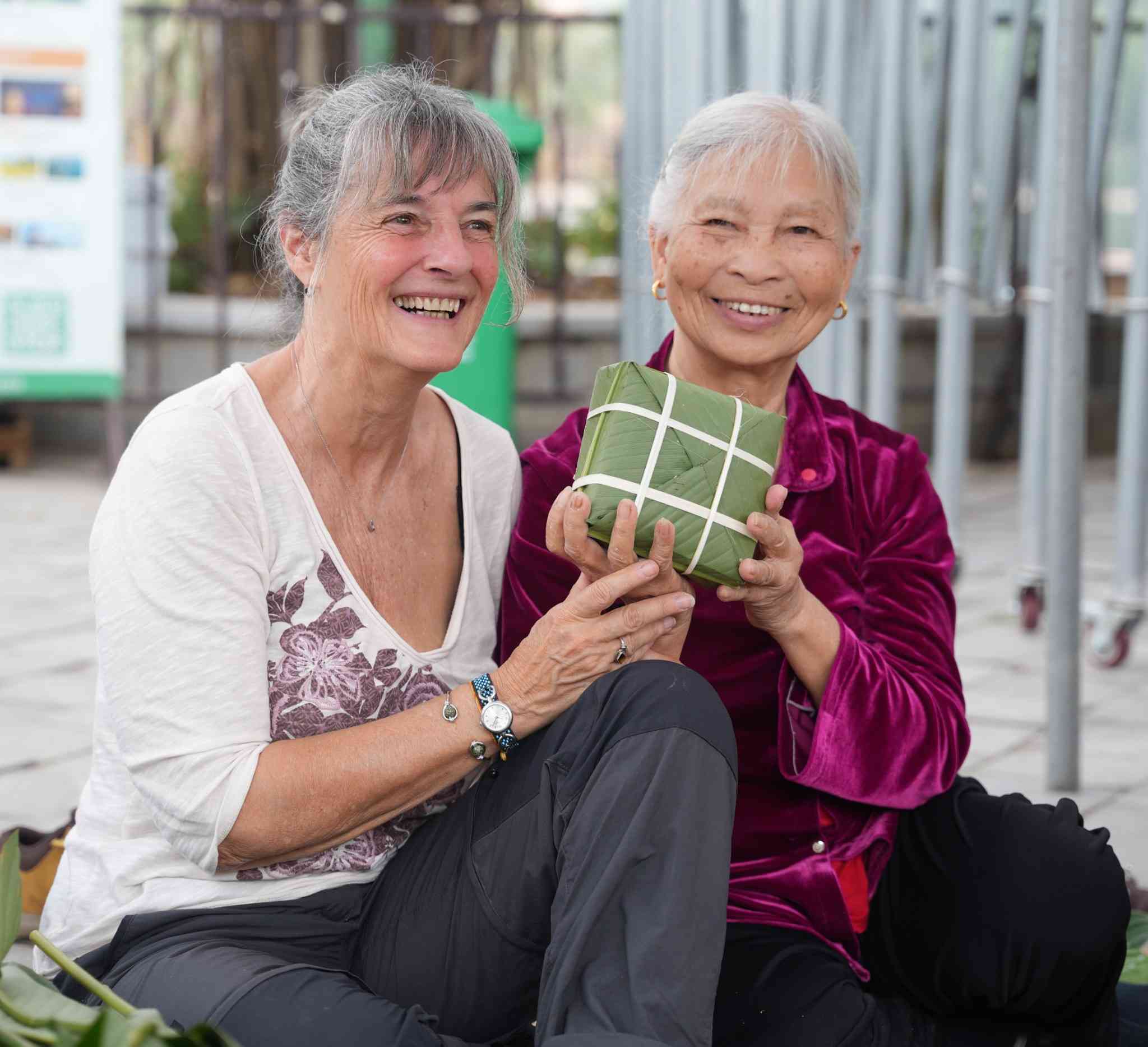 Many international tourists coming to Tam Coc - Bich Dong tourist area also participate in experiencing wrapping banh chung and learning about the meaning of the green banh chung on the traditional Tet holiday of the Vietnamese people.
