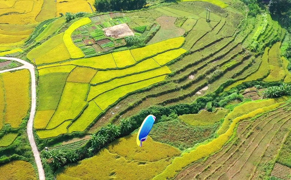 Trải nghiệm bay trên dù lượn giúp du khách được chiêm ngưỡng toàn cảnh thiên nhiên hùng vĩ, bát ngát núi rừng, ruộng bậc thang ở Bình Liêu. Đặc biệt ở mùa này, các ruộng bậc thang chín vàng, óng ánh mang lại khung cảnh tuyệt đẹp, khiến du khách không thể nào quên.