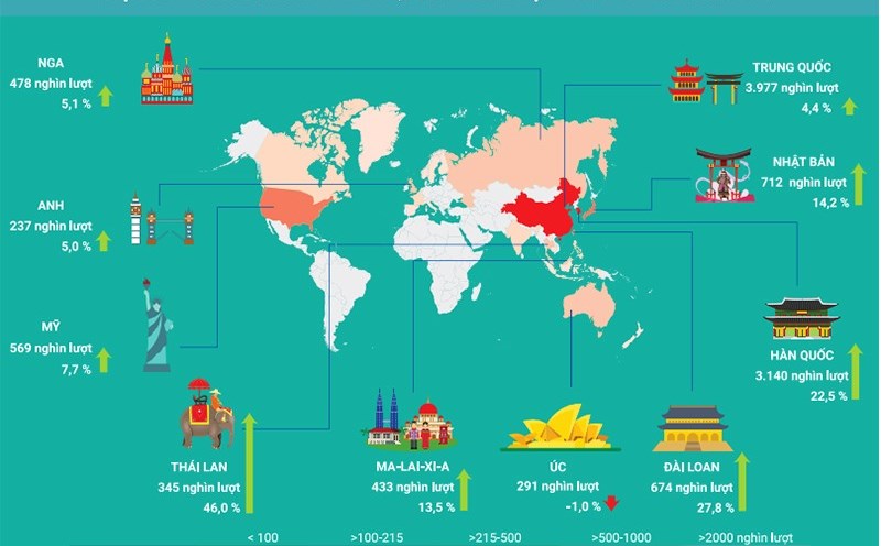 Năm 2018, Việt Nam đón trên 386 nghìn lượt khách Úc, tăng 4,5% so với năm 2017. Tính riêng 9 tháng đầu năm 2019, đã có 291.880 du khách Úc đến Việt Nam.