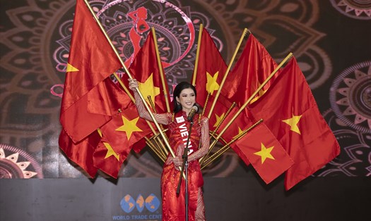 Trước đó, trong vòng thi trang phục dân tộc diễn ra tối 20.10 tại Jakarta, Thiên Ân diện thiết kế tên Trúc chỉ, trình diễn cuối cùng.