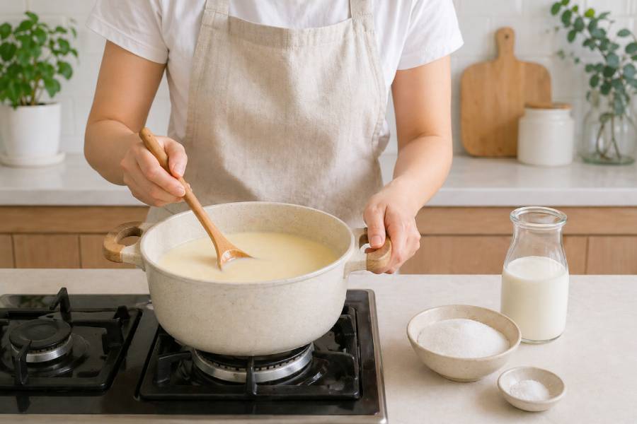 Pour the filtered milk into the pot, add fresh milk, sugar and a little salt to balance the flavor. Cook over low heat, stir well to prevent the milk from burning at the bottom of the pot.