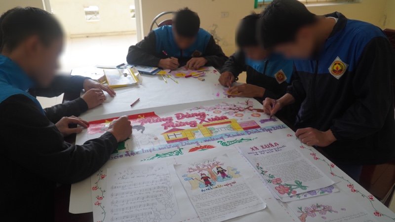 In another corner, in the library room, a group of students attentively decorate wall newspapers. Colored papers, letters, and drawings are meticulously completed. Some students meticulously mark each line of text, some students diligently color the spring painting. On the wall newspaper pages, images of apricot blossoms, peach blossoms, and banh chung appear next to lines sharing about family, about the desire to correct mistakes and rebuild life.