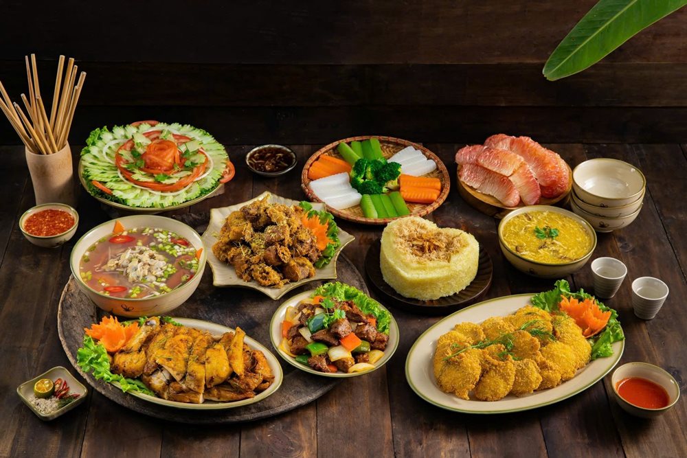 For the vegetarian tray on the full moon day, you should choose fruits such as apples, oranges, watermelons, bananas, Buddha's hand. Familiar, easy-to-make vegetarian dishes include vegetarian ham, coconut sticky rice, vegetarian stir-fried vermicelli, stir-fried vegetables, sweet soups, etc.