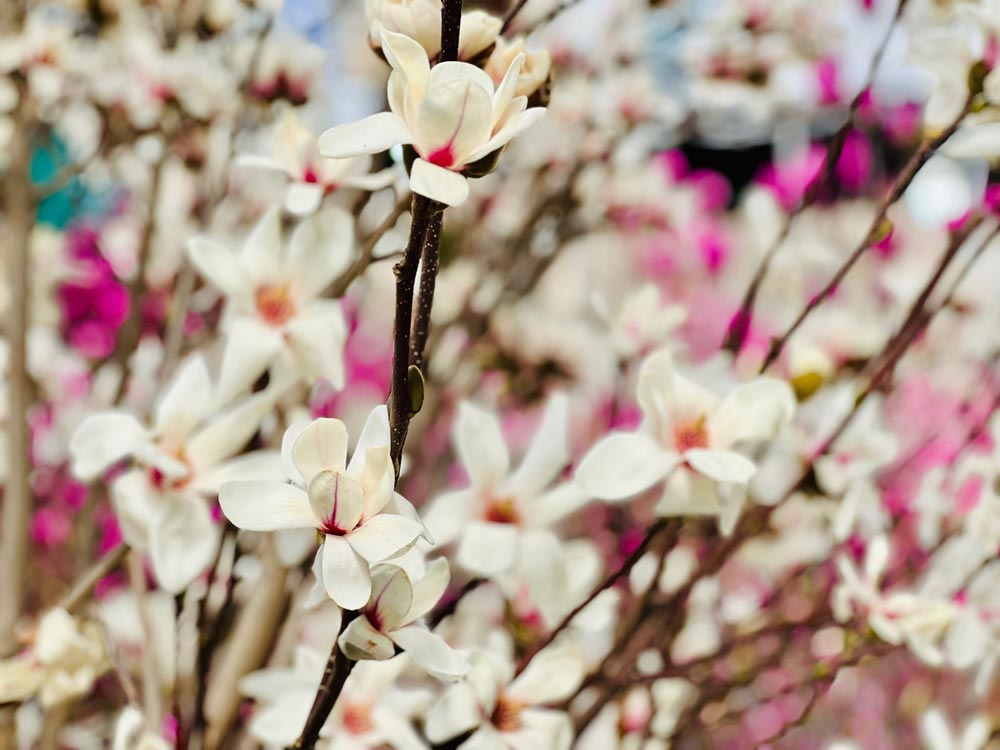 In a concentrated display area, magnolia flowers are stacked tightly on both sides of the walkway in large quantities, attracting a large number of people to stop to refer to, take photos and choose to buy.