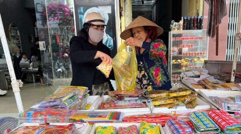 Many acquaintances in the market are familiar with the image of Mrs. Lan sitting next to the joss paper counter every year-end occasion, almost never missing a Tet season. Whether it's sunny or rainy, she is still present from early morning. Selling goods is not only to earn extra income but also to maintain her familiar rhythm of life.