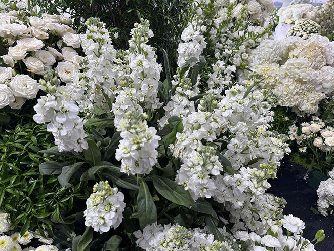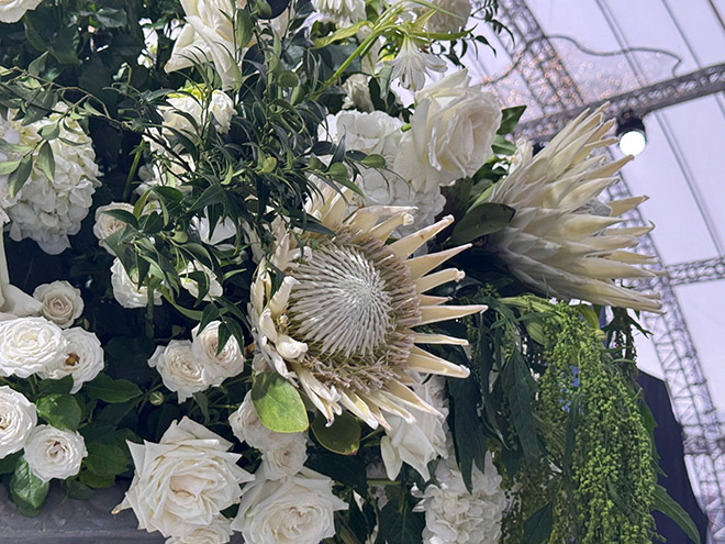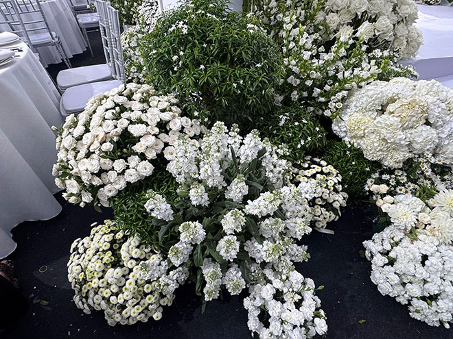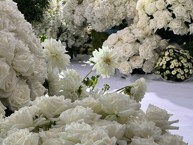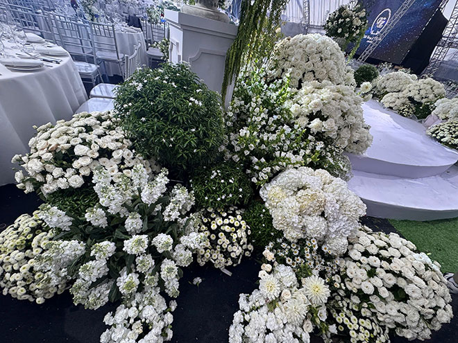The wedding space was completed with the white color of many types of fresh flowers. Thousands of fresh flowers such as white roses, white hydrangeas, white chrysanthemums... are used to cover the main areas: entrances, walkways, wedding theater stages.