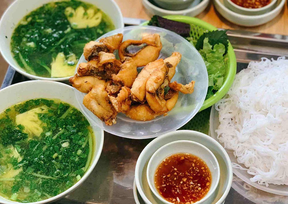 Hanoi - The fish noodle shop on Nguyen Luong Bang street attracts many diners thanks to its crispy fish pieces, light broth, and spicy and sour dipping sauce.