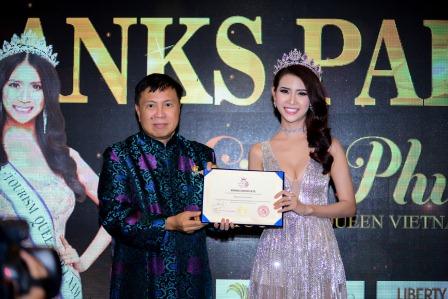 Ông Alex Liu – Chủ tịch Miss Tourism Queen International trao chứng nhận Nữ hoàng Du lịch Việt Nam 2017 cho Á khôi Liên Phương. Ảnh: Huy Trần |