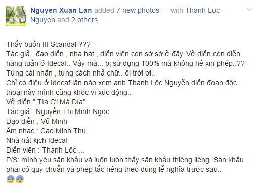 | Người mẫu Xuân Lan thấy buồn khi ê-kíp "còn sờ sờ ở đây vậy mà vở diễn bị sử dụng 100% mà không hề xin phép". Ảnh: FBNV. |