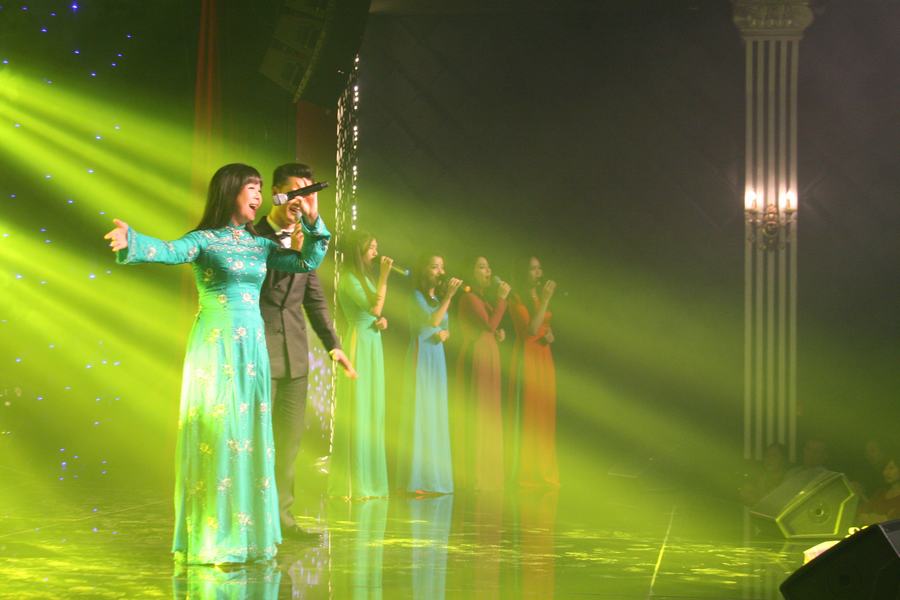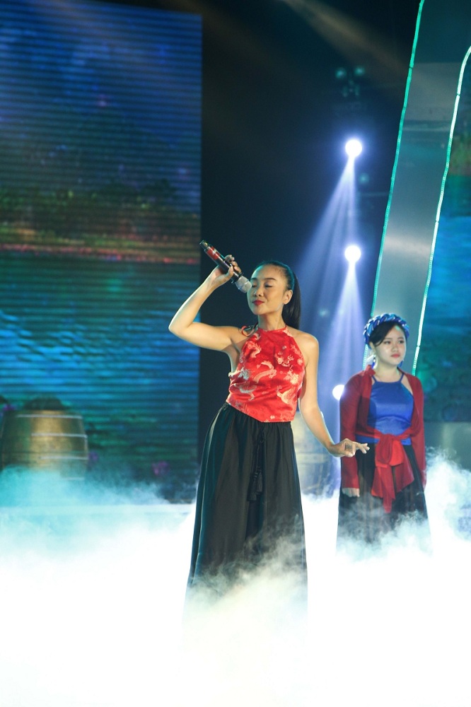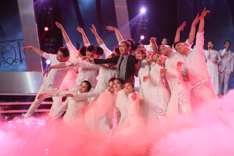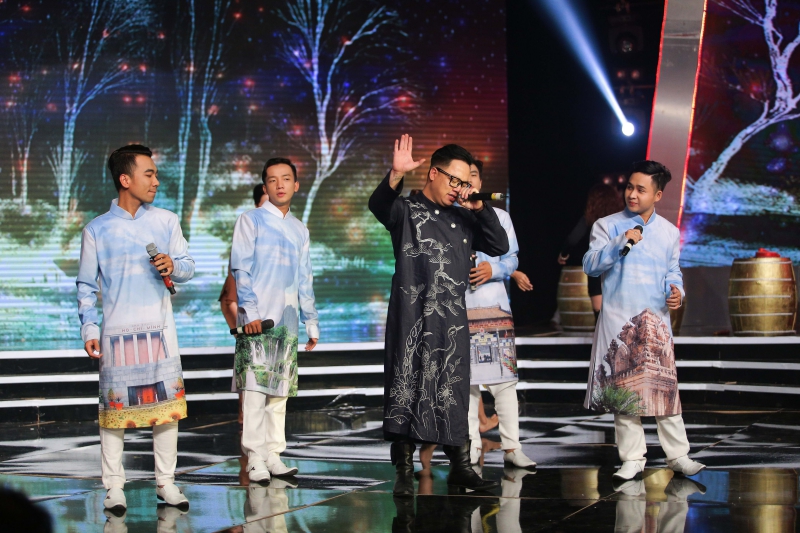 Giám khảo Đoan Trang kết hợp cùng nhóm Passion qua tiết mục biểu diễn “Ngẫu hứng sông Hồng”. |