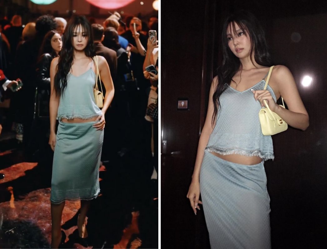 Jennie wore a light-worked shirt with 2 strings and a pastel blue silk dress, combined with accessories such as a prominent yellow bag. In particular, the female singer had her natural curly hairstyle and seductive smoky eye makeup to create highlights.