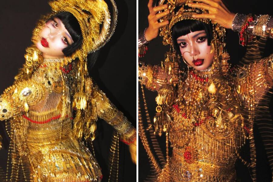 Lisa wore a gold-plated bodysuit, covered with gold, sparkling chains and other brilliant yellow accessories. The details on the outfit and the hood are meticulously and elaborately designed.