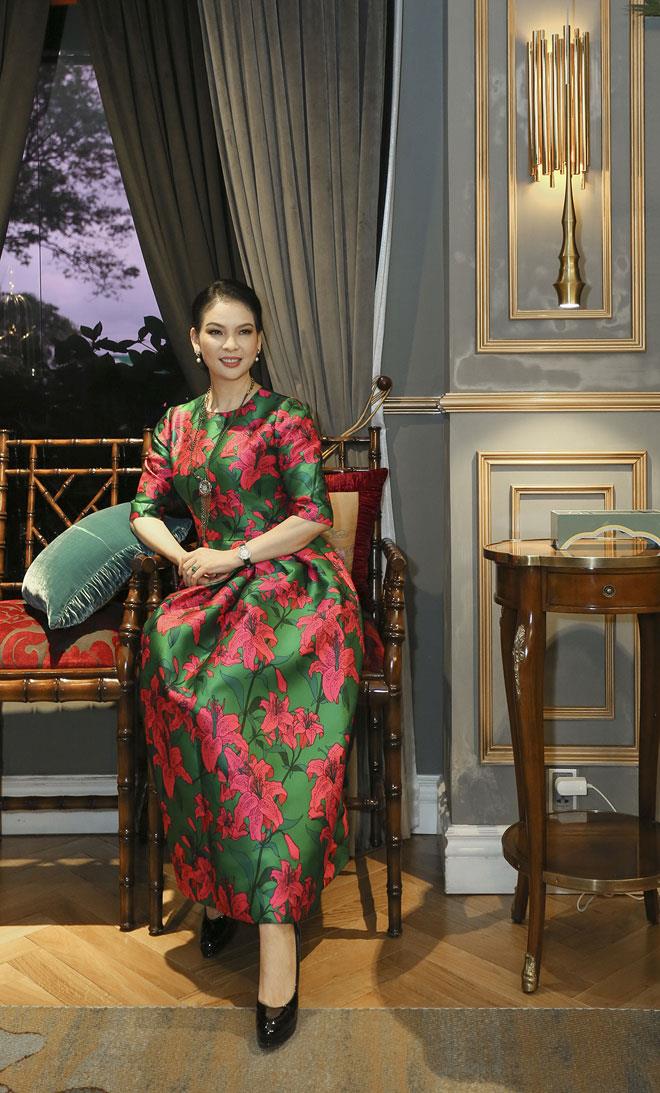 Diễm My trẻ trung với sắc xanh lá kết hợp tông cam rực rỡ. Họa tiết hoa được thực hiện bằng phương pháp thêu tinh tế.