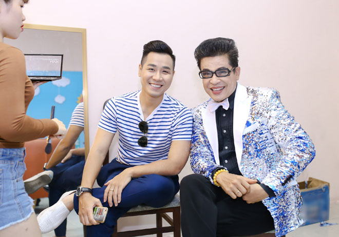 | Trước đó, anh thân thiết chụp hình kỷ niệm với MC đàn anh là Thanh Bạch trong chương trình "Tuyệt đỉnh song ca nhí". |