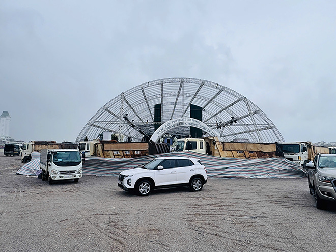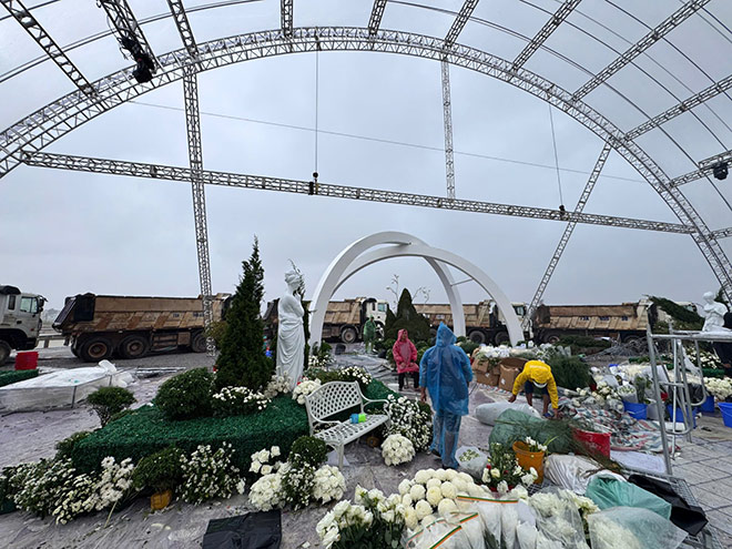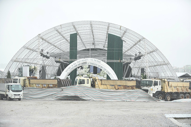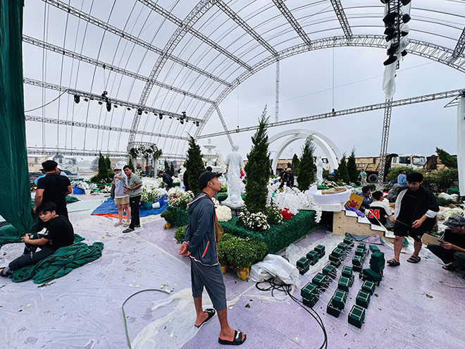 Currently, the wedding tent construction team in Quang Tri is still rushing to complete the final decoration in terms of both sound and lighting.