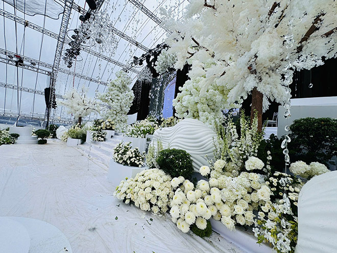 The white color of the flowers is immediately covering the entrance of the wedding tent, bringing a luxurious space. The lighting system is fully equipped with modern and functional functions to bring the most beautiful images on the big day of the bride and groom.