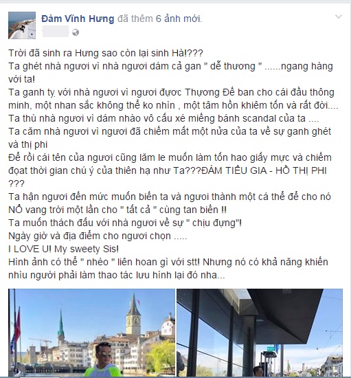 "Trời đã sinh ra Hưng sao lại còn sinh Hà? Ta ghét nhà ngươi vì nhà ngươi dám cả gan dễ thương ngang hàng với ta. Ta ghen tỵ với nhà người vì nhà ngươi được Thượng đế ban cho cái đầu thông minh, nhan sắc không thể không nhìn, một tâm hồn khiêm tốn và rất đời" - là những lời Đàm Vĩnh Hưng vừa chia sẻ trên trang cá nhân dành cho Hồ Ngọc Hà giữa lúc nữ ca sĩ đang phải đối mặt với những lùm xùm không hay sau lời tố cáo chèn ép của Minh Hằng.