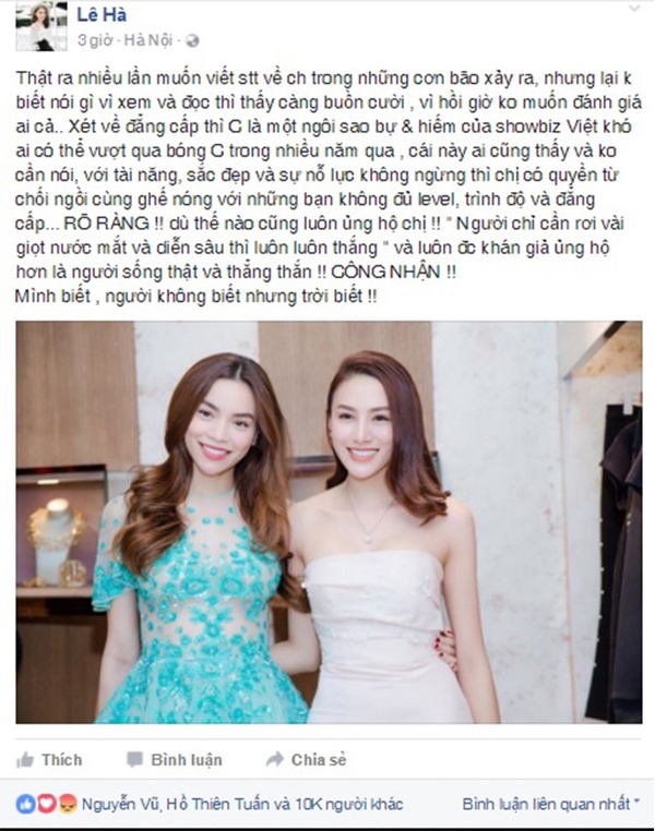 Mở đầu bài viết, Lê Hà khẳng định từ trước đến giờ cô không muốn đánh giá ai cả. Nhưng khi đọc và xem những diễn biến về vụ lùm xùm giữa Hồ Ngọc Hà và Minh Hằng thì cô cảm thấy buồn cười nên quyết định lên tiếng.