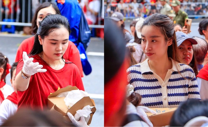 Miss Do My Linh, Duy Manh's wife give food to people watching the parade