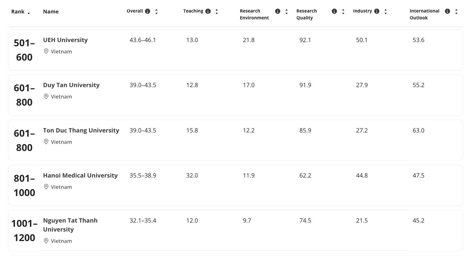 The two new names ranked this time are Nguyen Tat Thanh University, ranked 1001-1200 and Da Nang University, ranked 1501+.