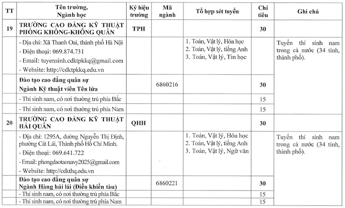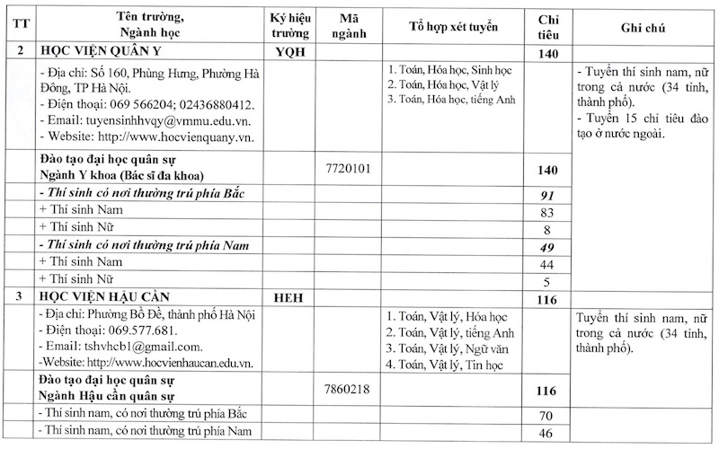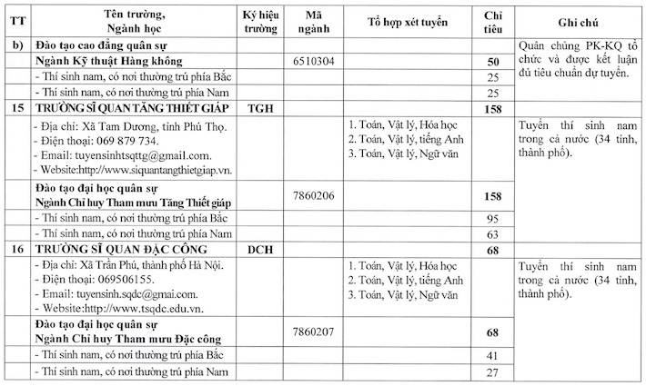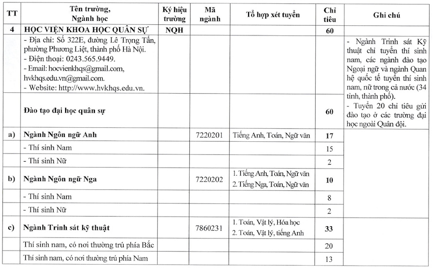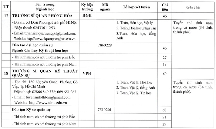 In which, many technical training schools such as the Military Technical Academy, Naval Academy, School of Information Officers or School of Armored Officers mainly consider combinations with Mathematics and Physics as the foundation; while some majors belonging to the social science group at institutions such as the Border Guard Academy or the School of Political Officers use combinations with Literature and Mathematics combined with History, Geography or Foreign Languages.