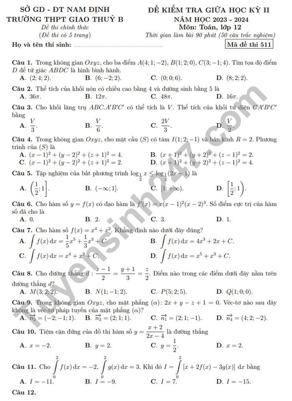 Dưới đây là chi tiết đề thi giữa kì 2 năm học 2023 - 2024 môn Toán lớp 12 của Trường THPT Giao Thủy B, Sở GDĐT Nam Định.