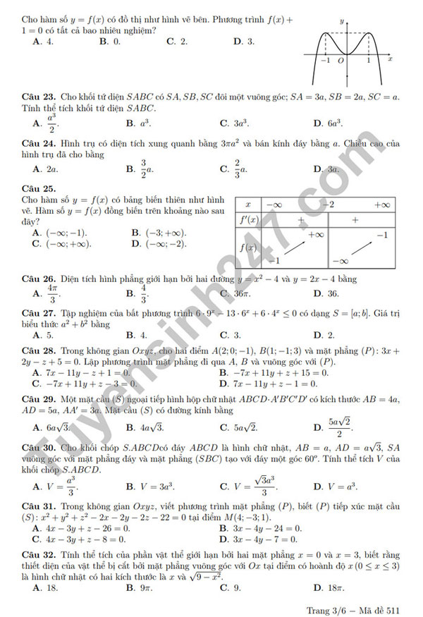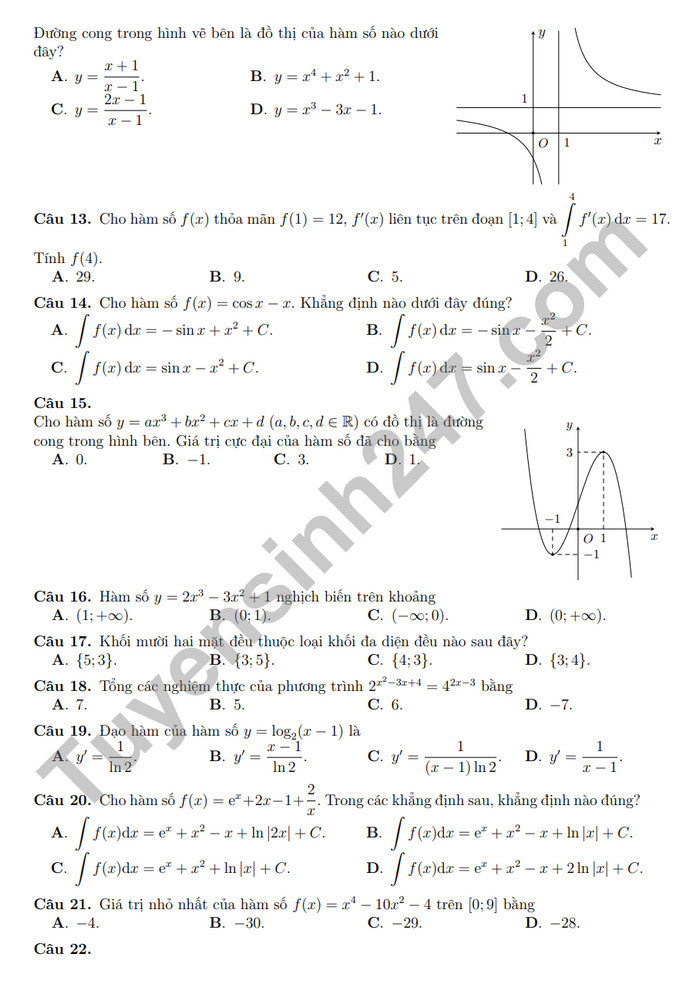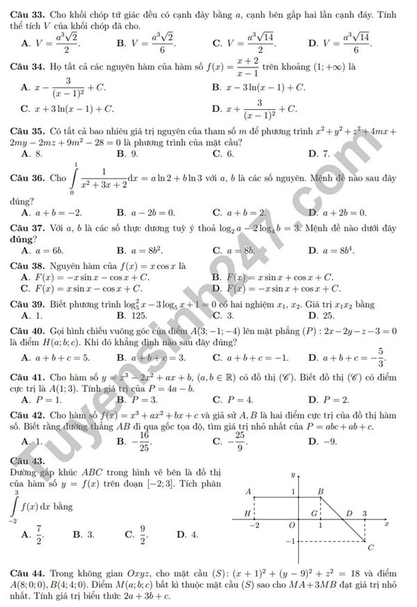 Đáp án đề thi giữa kì 2 môn Toán lớp 12
