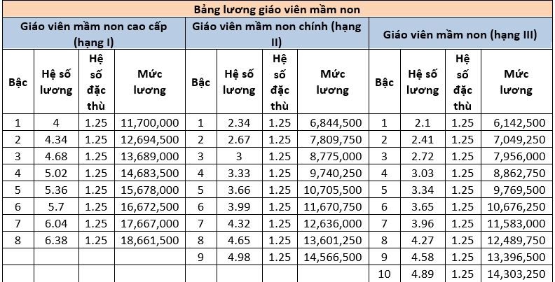 Below is the salary table for preschool teachers in 2026, applying a special salary coefficient according to the draft Decree regulating salary policies and allowances for teachers: