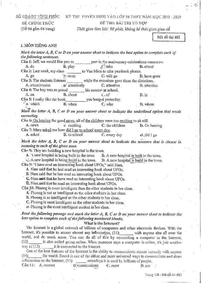 Lao Động xin đăng tải đề thi môn tổ hợp của tỉnh Vĩnh Phúc để học sinh và giáo viên có thể tham khảo. Bởi từ năm 2019, hình thức thi này cũng được áp dụng ở Hà Nội: