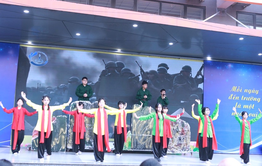 On stage, the art performance was elaborately staged by teachers and students of Tran Duy Hung Secondary School, including singing, dancing, short plays, stage productions...