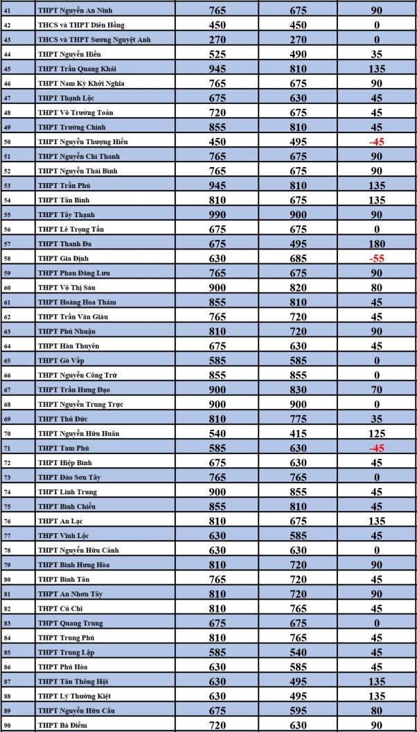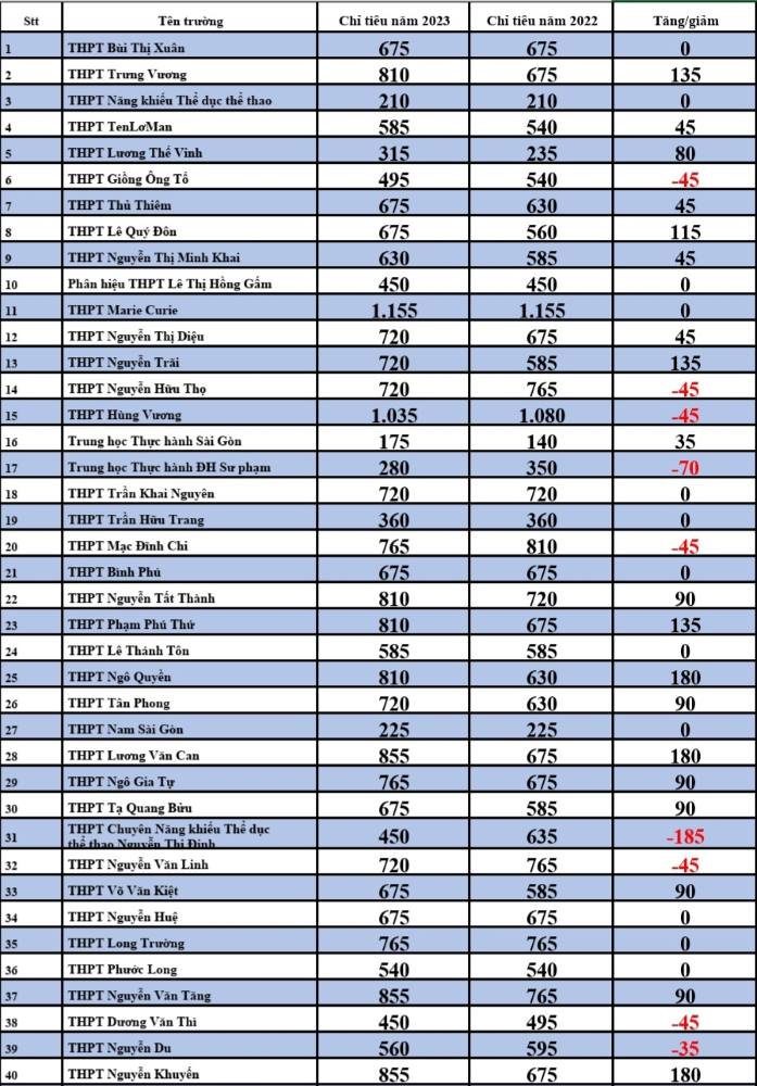 Ở chiều ngược lại, giảm mạnh nhất là Trường THPT Phong Phú (225 chỉ tiêu); Trường THPT Chuyên Năng khiếu TDTT Nguyễn Thị Định (185 chỉ tiêu); Trường THPT Năng khiếu TDTT Bình Chánh (180 chỉ tiêu),...