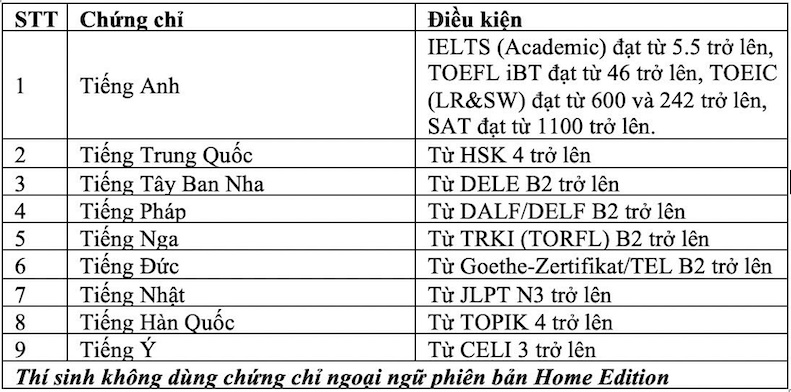 For candidates applying according to Method 2, candidates need to have an international foreign language certificate for no more than 2 years from the date of issuance of the certificate to May 1, 2026, a certificate issued by an organization authorized by the Ministry of Education and Training for one of the following certificates: