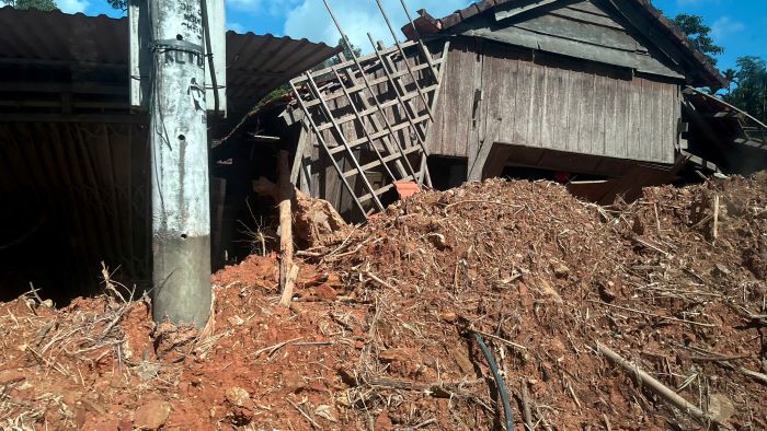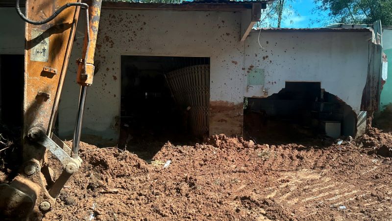 In many places, rocks and soil spilled straight across the road, hitting people's houses, leaving the scene in disarray. The road surface is covered with mud, creating slippery sections that force vehicles to stop.