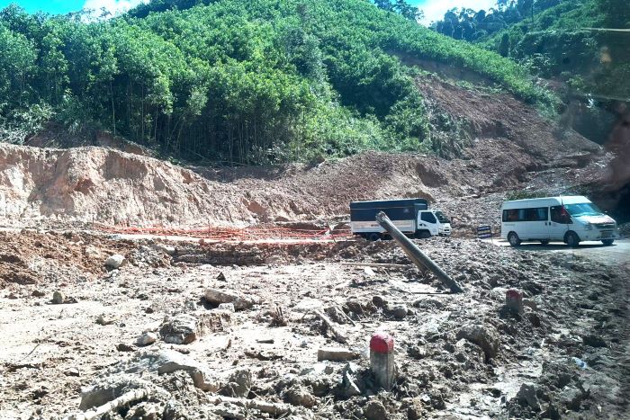 There are landslides of entire rocks and soil, the space is divided by dangerous long slides from the top of the mountain to the foot of the road. From afar, the cracks are clearly visible on the mountainside, threatening to continue to slide down at any time.