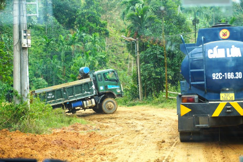 After a long period of heavy rain, National Highway 40B from Tra My commune to Tra Leng commune still has dozens of old and new landslides. Along the route, large patches of rocks and soil collapsed, some places were still wet, showing that the landslide had only occurred not long before.