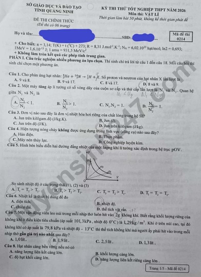 2026 Physics high school graduation mock exam - Quang Ninh Department of Education and Training
