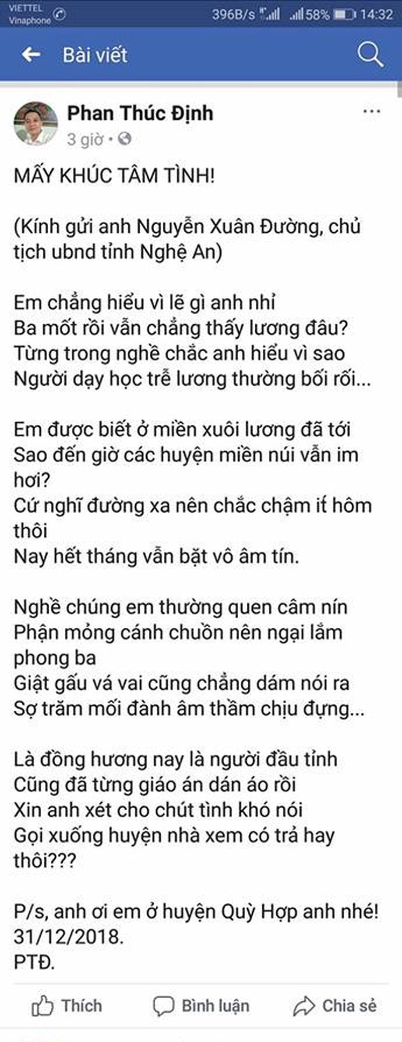Bài thơ có ghi kính gửi ông Nguyễn Xuân Đường - Chủ tịch UBND tỉnh Nghệ An. Sau khi bài thơ trên đăng lên Facebook cá nhân của thầy Định, Chủ tịch UBND tỉnh Nghệ An đã ngay lập tức chỉ đạo các cơ quan chức năng vào cuộc tìm hiểu nguyên nhân và những khó khăn để giúp đỡ giáo viên.