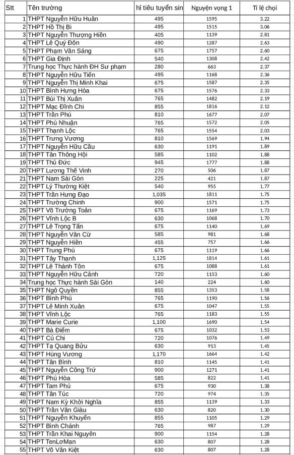 The group of schools with a competition ratio of nearly 1/2 includes: Le Quy Don High School (1/1.95), Nguyen Thi Minh Khai High School (1/1.92), Phu Nhuan High School (1/1.79), Vo Truong Toan High School (1/1.78), Ngo Quyen High School (1/1.75) and Nguyen Huu Cau High School (1/1.73).