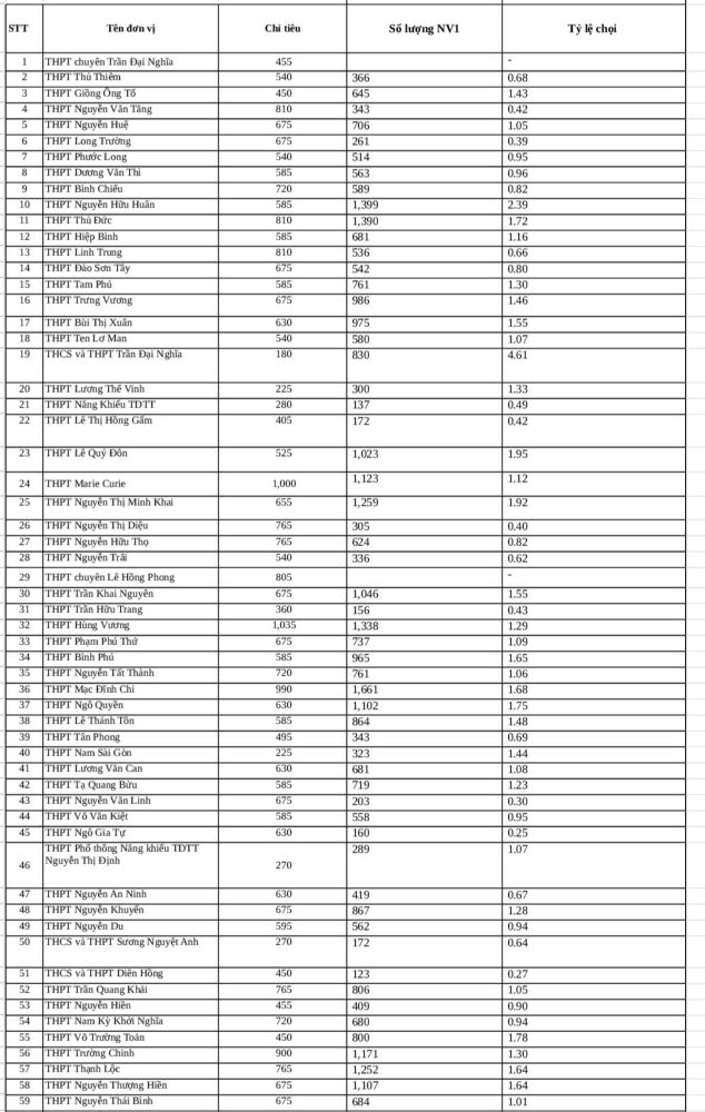 The remaining schools in the high competition ratio group in 2024 include: Le Quy Don High School (1/2.63), Pham Van Sang High School (1/2.60), Gia Dinh High School (1/2.42), Practical High School - University of Pedagogy (1/2.37), Nguyen Huu Tien High School (1/2.36), Nguyen Thi Minh Khai High School (1/2.35), Binh Hung Hoa High School (1/2.33), Bui Thi Xuan High School (1/2.19), Mac Dinh Chi High School (1/2.12), Tran Phu High School (1/2.07), Phu Nhuan High School (1/2.05) and Thanh Loc High School (1/2.03).