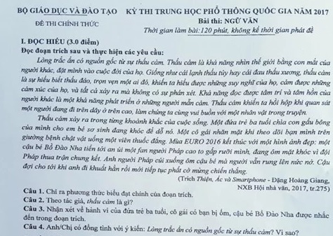 | Phần đọc hiểu trong đề thi Ngữ văn kỳ thi THPT quốc gia 2017. |