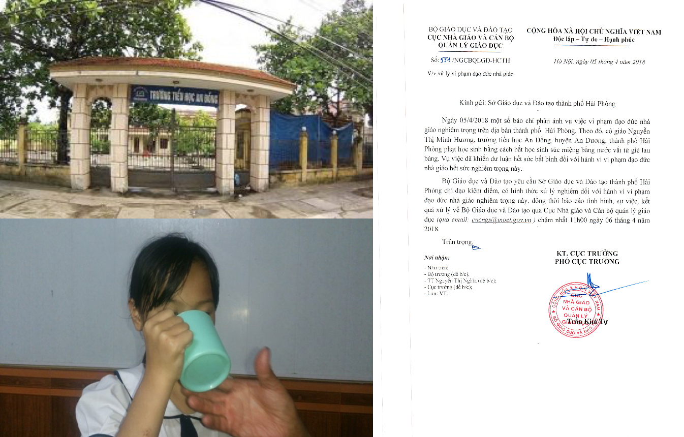 Một giáo viên Trường tiểu học An Đồng, huyện An Dương, TP.Hải Phòng đã bắt học sinh súc miệng bằng nước vắt từ giẻ lau bảng, sau khi học sinh mắc lỗi nói chuyện riêng trong lớp.
