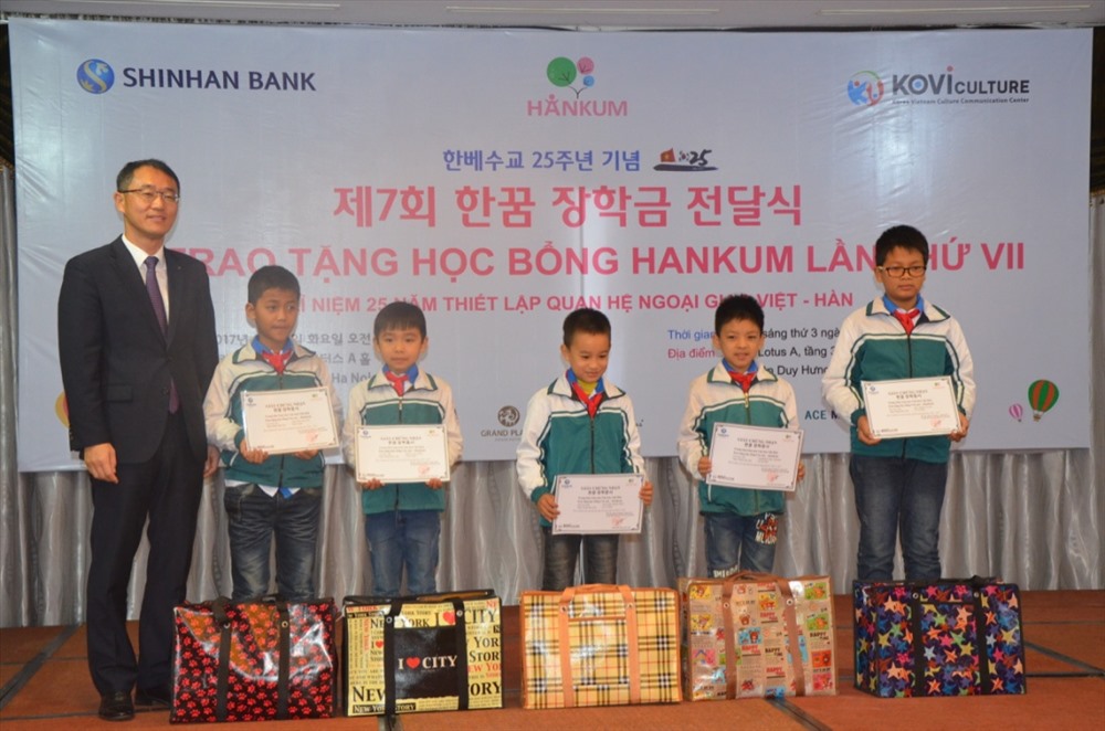 Ngày 5.12, tại Hà Nội, Ngân hàng Shinhan Hàn Quốc đã tài trợ 100 suất học bổng trao cho những em học sinh có hoàn cảnh khó khăn trong lễ trao học bổng Hankum lần thứ 7 do Trung tâm Giao lưu Văn hoá Việt - Hàn tổ chức.