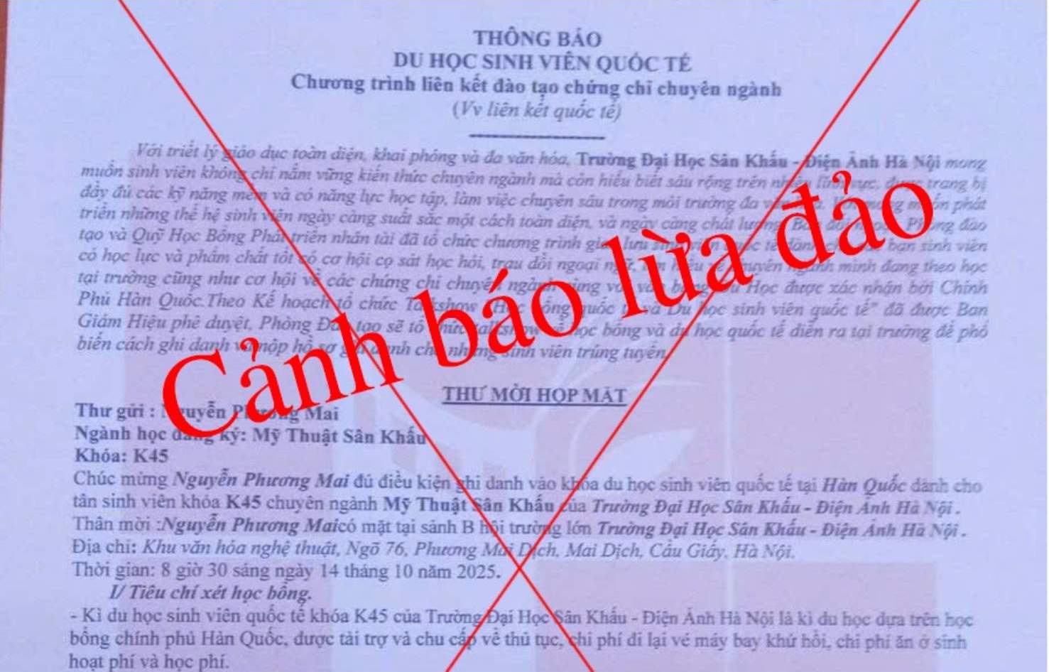 Hanoi University of Theatre and Cinema urgently warns of fake documents " international study abroad announcement", recommends that students and parents be vigilant.