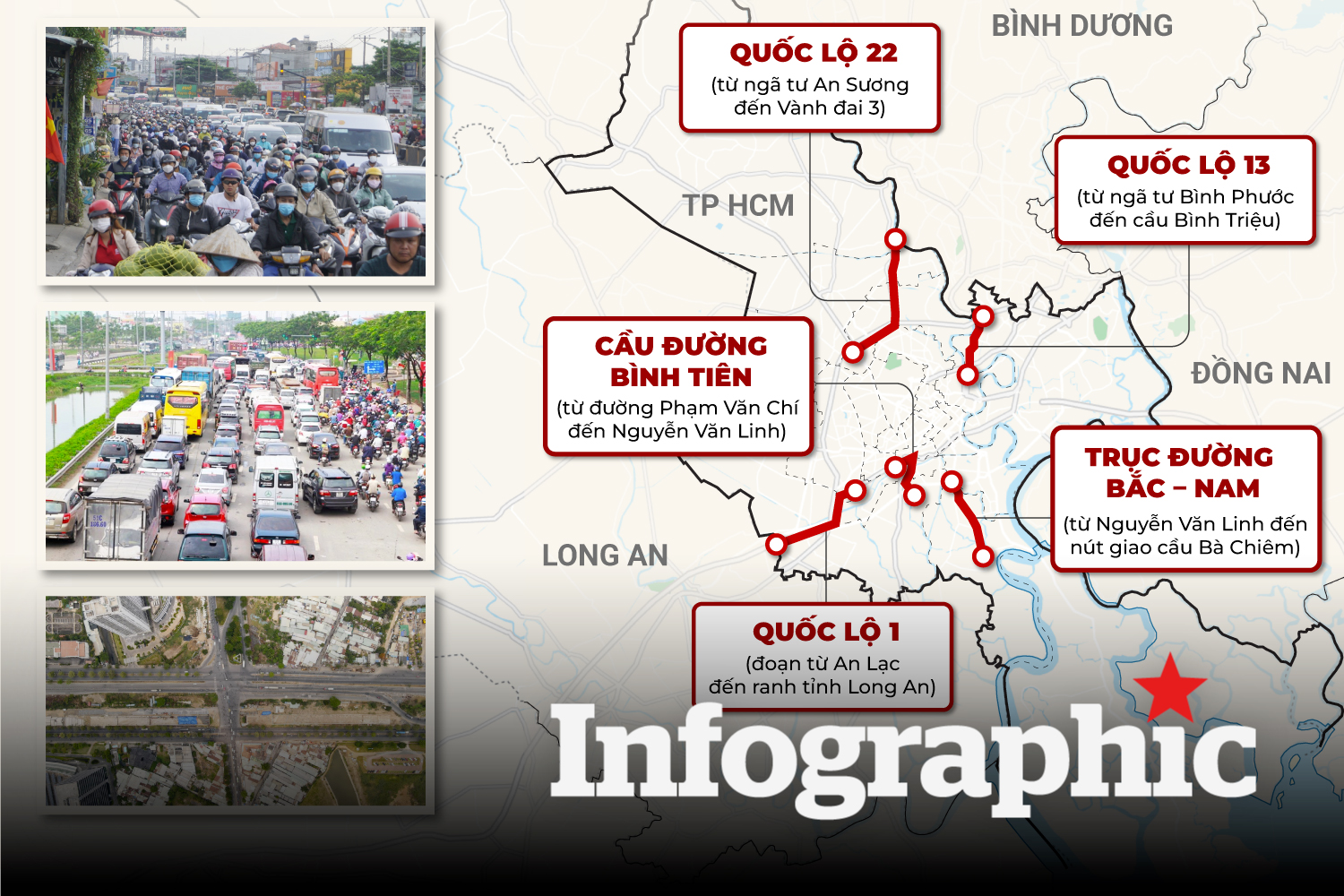 Quốc lộ 1 (đoạn từ An Lạc đến ranh tỉnh Long An) dài 9,6km sẽ được mở rộng từ 4 lên 8 làn xe.