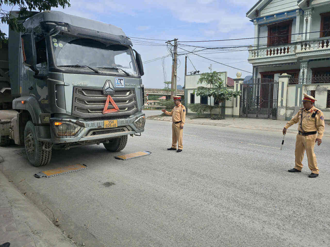 Present at km47, National Highway 12B, the section passing through Yen Son Ward, Ninh Binh), since 6:00 a.m. on October 28, the Traffic Police force has been present and set up checkpoints to check the weight of vehicles carrying construction materials.