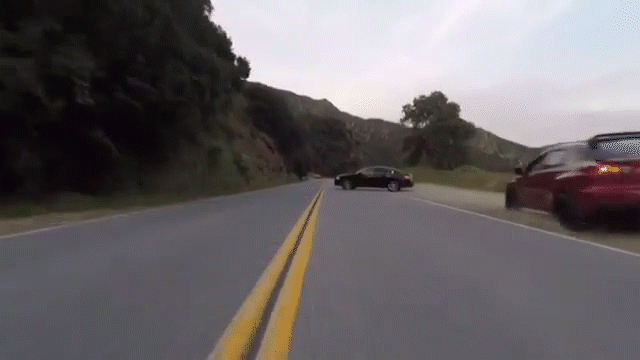 Do đi với tốc độ cao, tài xế Mitsubishi Evo đã không thể dừng lại khi có chiếc ôtô bất ngờ chắn giữa đường. May mắn là tài xế đã có thể lách vào lề và thoát nạn thành công.