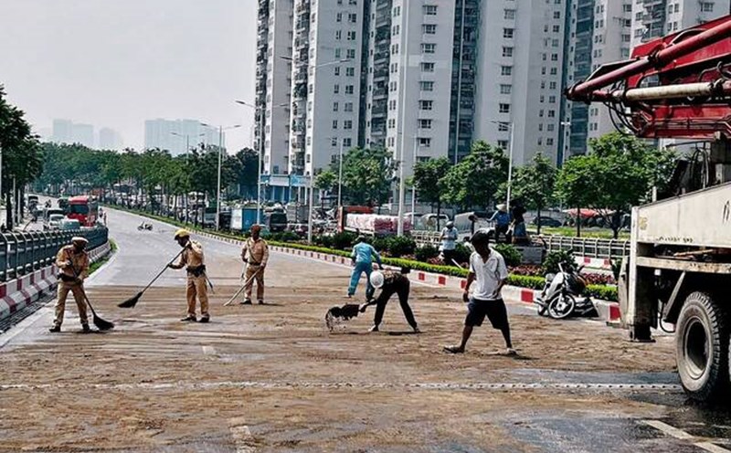 Hanoi - Concrete pumps traveling on the Bac Hong railway overpass, even though they are on the runway, cause oil stains to cover the bridge surface. The authorities quickly arrived.