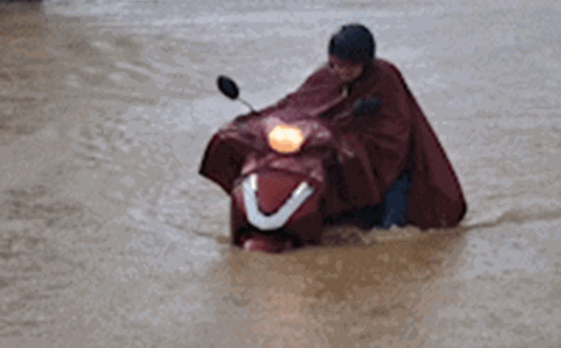 Motorbikes going in the wrong direction on the highway to avoid flooding in Hanoi
